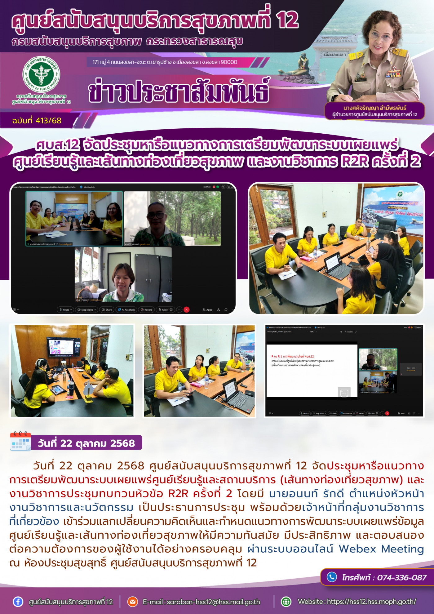 วันที่ 22 ตุลาคม 2568 ศูนย์สนับสนุนบริการสุขภาพที่ 12 จัดประชุมหารือแนวทางการเตรียมพัฒนาระบบเผยแพร่ศูนย์เรียนรู้และสถานบริการ (เส้นทางท่องเที่ยวสุขภาพ) และงานวิชาการประชุมทบทวนหัวข้อ R2R ครั้งที่ 2 โดยมี นายอนนท์ รักดี ตำแหน่งหัวหน้างานวิชาการและนวัตกรรม เป็นประธานการประชุม พร้อมด้วยเจ้าหน้าที่กลุ่มงานวิชาการ ที่เกี่ยวข้อง เข้าร่วมแลกเปลี่ยนความคิดเห็นและกำหนดแนวทางการพัฒนาระบบเผยแพร่ข้อมูลศูนย์เรียนรู้และเส้นทางท่องเที่ยวสุขภาพให้มีความทันสมัย มีประสิทธิภาพ และตอบสนอง ต่อความต้องการของผู้ใช้งานได้อย่างครอบคลุม ผ่านระบบออนไลน์ Webex Meeting ณ ห้องประชุมสุขสุทธิ์ ศูนย์สนับสนุนบริการสุขภาพที่ 12